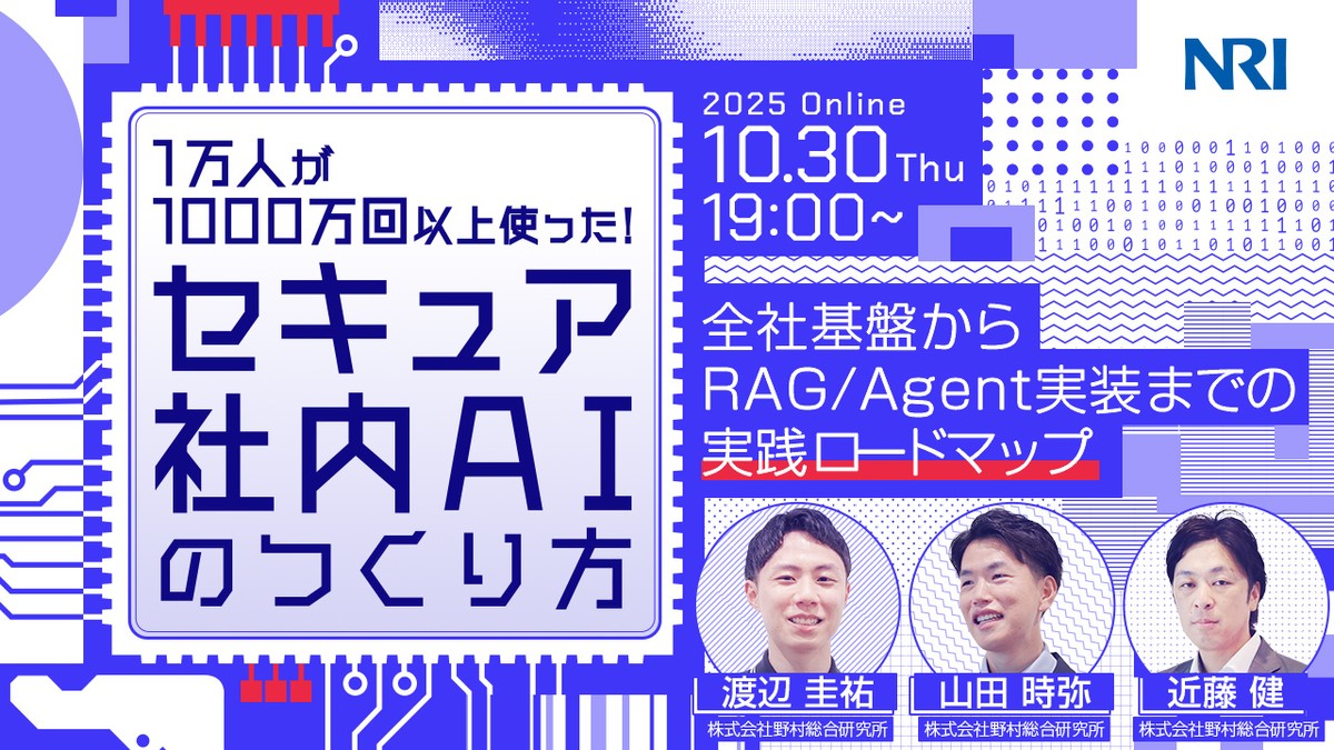 NRIが構築‧運⽤してきた“全社規模のセキュア⽣成AI環境”と、そこで得られた実装知⾒を余すことなくご紹介します。