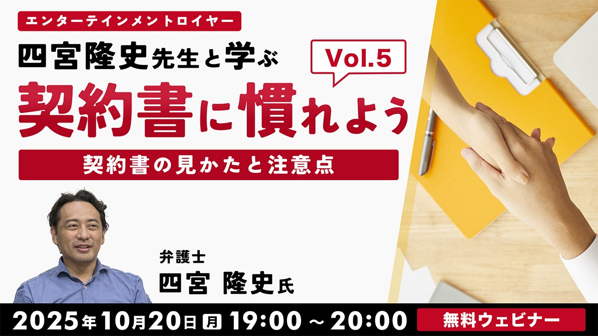 10月20日(月)19:00~ 契約書に慣れよう! エンターテインメントロイヤー四宮隆史先生と学ぶ ~契約書の見かたと注意点~Vol.5