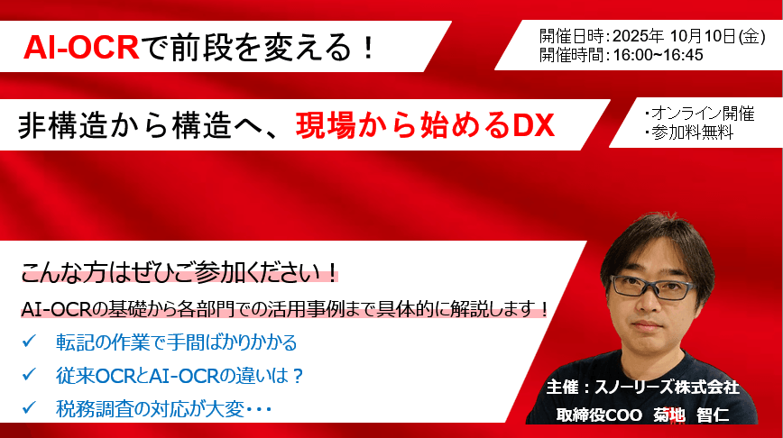 本セミナーでは、AI-OCRの基礎から、当社のソリューション「SmartDC」を使った電子帳簿保存対応、そして購買・経理・営業・製造など各部門での活用事例まで、具体的に解説します。