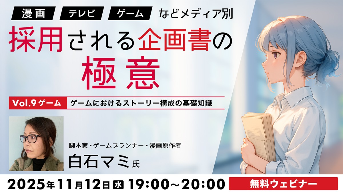 漫画、テレビ、ゲームといったエンタメ業界でジャンルを超えて仕事をするには、採用される企画書の制作が不可欠です。このウェビナーでは、テレビシナリオ・漫画原作・ゲームシナリオと、多岐にわたり活躍してきたクリエイターが、それぞれのメディアで必要とされるスキルと、採用される企画書の作り方について解説します。