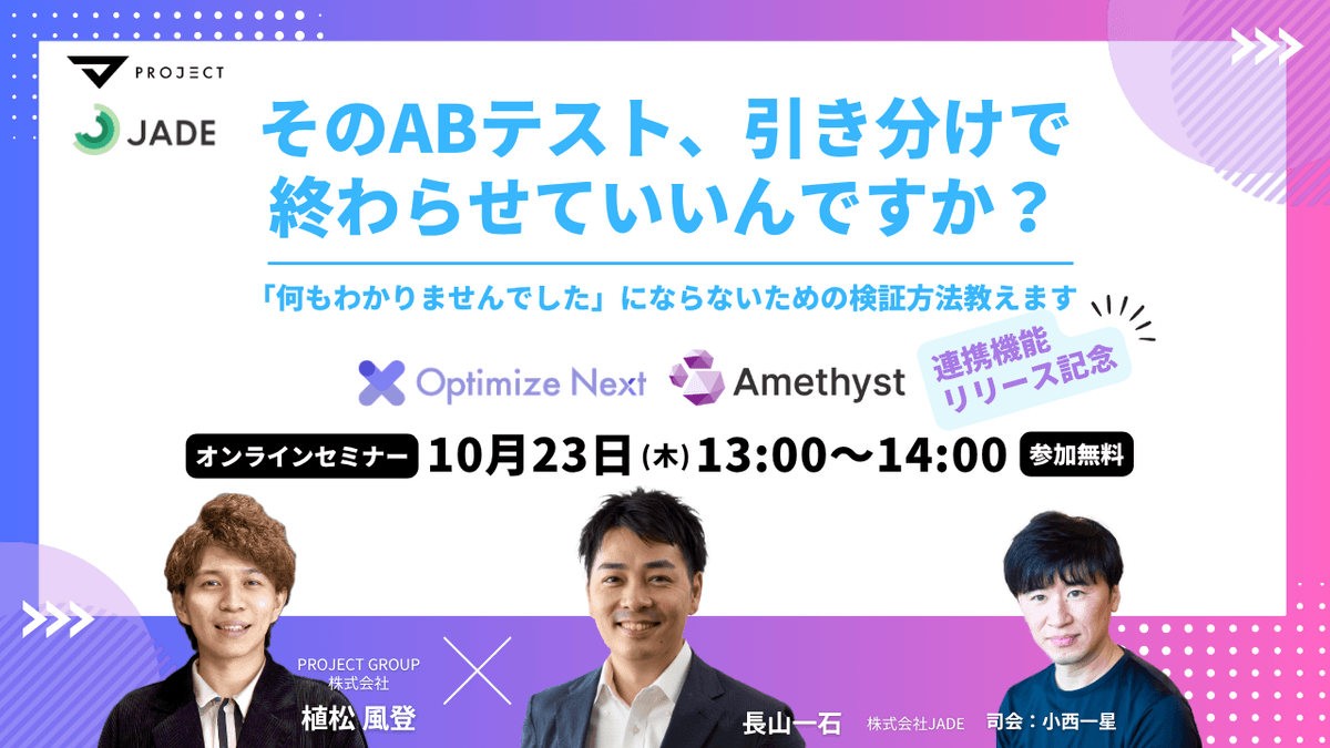 Amethystを提供する株式会社JADE 代表取締役の長山様と、Optimize Next 開発責任者の植松が、実際の画面を見せながら具体的に解説します。