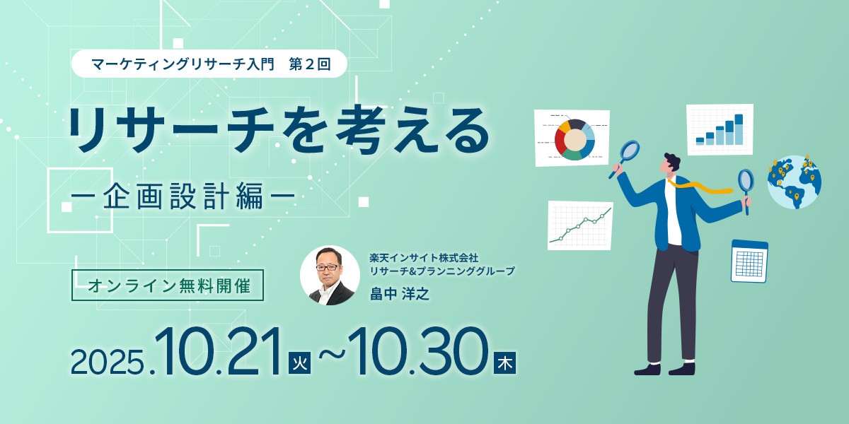 今回のセミナーは、マーケティングリサーチの基礎をお伝えするシリーズの第2回「リサーチを考える –企画設計編–」となります。調査実施における企画設計(仕様書作成)を、ケーススタディを元に解説しており、企画設計のポイントが習得できる内容となります。