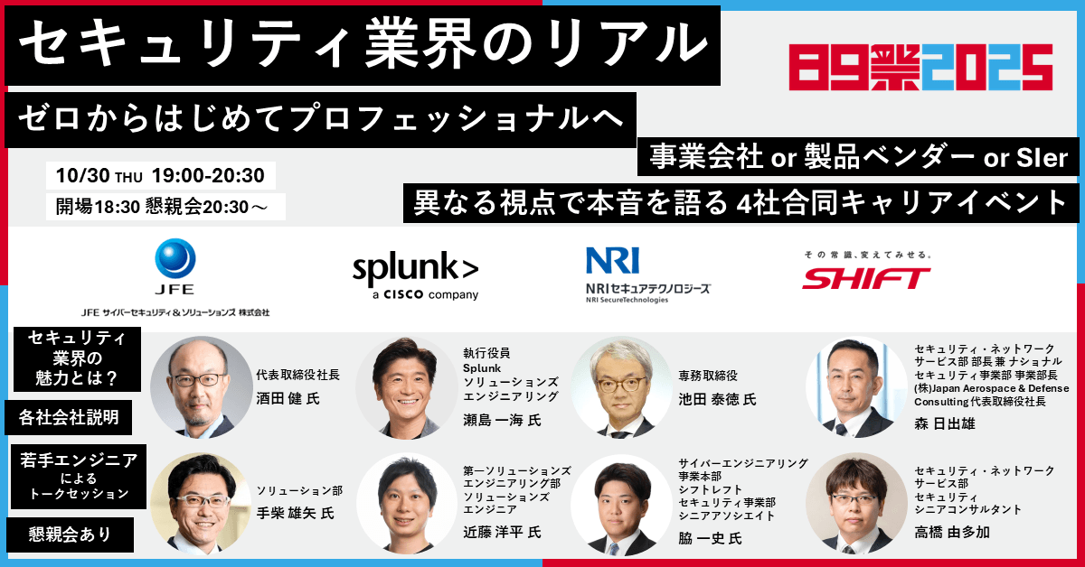 | 19:30〜20:00 | トークセッション ~先輩社員に聞く「キャリアの本音」~ JCSS × Splunk × NRIセキュア × SHIFTの4名の若手メンバーが登壇します。 初めてセキュリティに触れた瞬間やこのキャリアに惹かれた理由、 壁に当たった時にどんな行動や考えが突破口になったか、 社会、お客様、自社企業を守る責任感ややりがい、今後目指すキャリアなどを、 事業会社、製品ベンダー、SIerそれぞれの立場から話していただきます。 ● トークテーマ (1)セキュリティのキャリアを選んだ“きっかけ”は? (2)キャリアの中で直面した“壁”と、それをどう乗り越えたか? (3)セキュリティの仕事で感じる“やりがい”とは? ● 登壇者 1人目:JFEサイバーセキュリティ&ソリューションズ株式会社 前職サイバーセキュリティ系企業にてサイバーセキュリティ領域の戦略立案、体制整備、制度設計などに従事。 2024年の合弁会社設立を機に現職へ参画し、セキュリティ監視サービス等の立上げを担い活躍。 2人目:Splunk Services Japan合同会社 前職製造業にて社内SEとしてIT運用やデータ分析業務に従事後、Splunkにソリューションエンジニアとして入社。 データ活用やシステム運用の知見を活かし、セキュリティやオブザーバビリティ領域を中心に金融・通信・製造業など幅広い顧客支援を実施。現在はセキュリティおよびIT運用におけるAI活用支援や事例創出にも注力。 3人目:NRIセキュアテクノロジーズ株式会社 前職SIerにて、金融業向けのアプリケーション開発やインフラ・ネットワーク構築などエンジニアとして幅広い業務に従事。 5年目の節目に兼ねてから興味を持っていたセキュリティ領域に挑戦したいと考え、2024年に現職へ入社。現在はセキュリティコンサルタントとしてセキュリティ診断や企業のDevSecOps推進支援など、前職で培った経験を活かしながら活躍。 4人目:株式会社SHIFT 前職通信事業会社にてインフラ・ネットワークエンジニアとして従事後、セキュリティエンジニアへキャリアチェンジ。 2022年セキュリティ領域の立ちあげ期に現職へ入社し、セキュリティ領域における技術リーダーや、PM補佐・PMとして活躍。 |