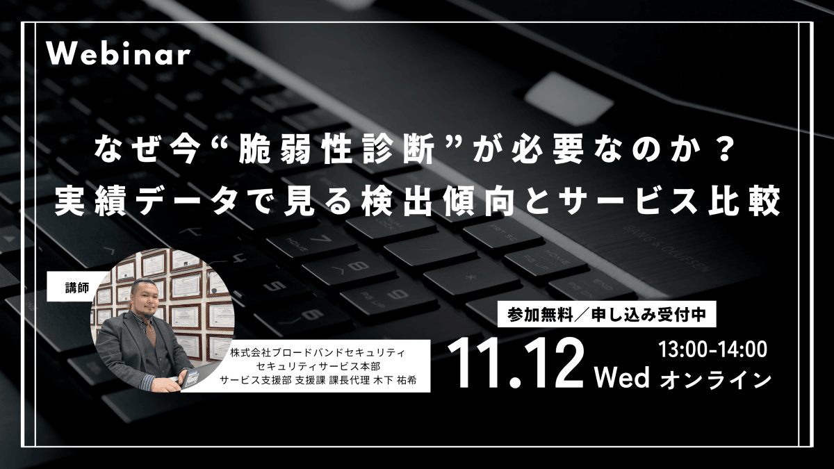 本ウェビナーでは、脆弱性診断の目的・必要性から費用・メリット、診断サービスの比較ポイントまでをわかりやすく解説します。さらに、当社がこれまでに実施した脆弱性診断の実績データをもとに、実際に多く検出される脆弱性の検出傾向や代表的な脆弱性事例をご紹介。自社に最適な脆弱性診断を選ぶ判断材料が得られる内容です。