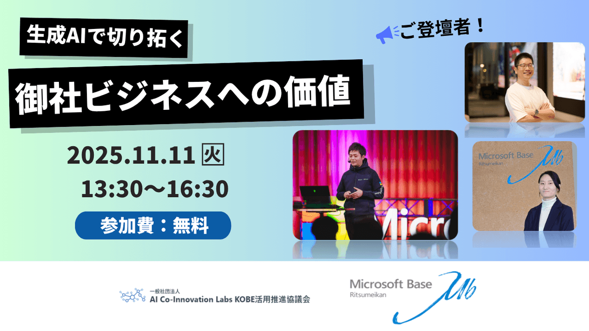 なお、本セミナーはMicrosoft Base Ritsumeikanと一般社団法人AI Co-Innovation Labs KOBE活用推進協議会の共催イベントのため、ご登録いただいた個人情報は共催者である一般社団法人AI Co-Innovation Labs KOBE活用推進協議会にも共有されます。