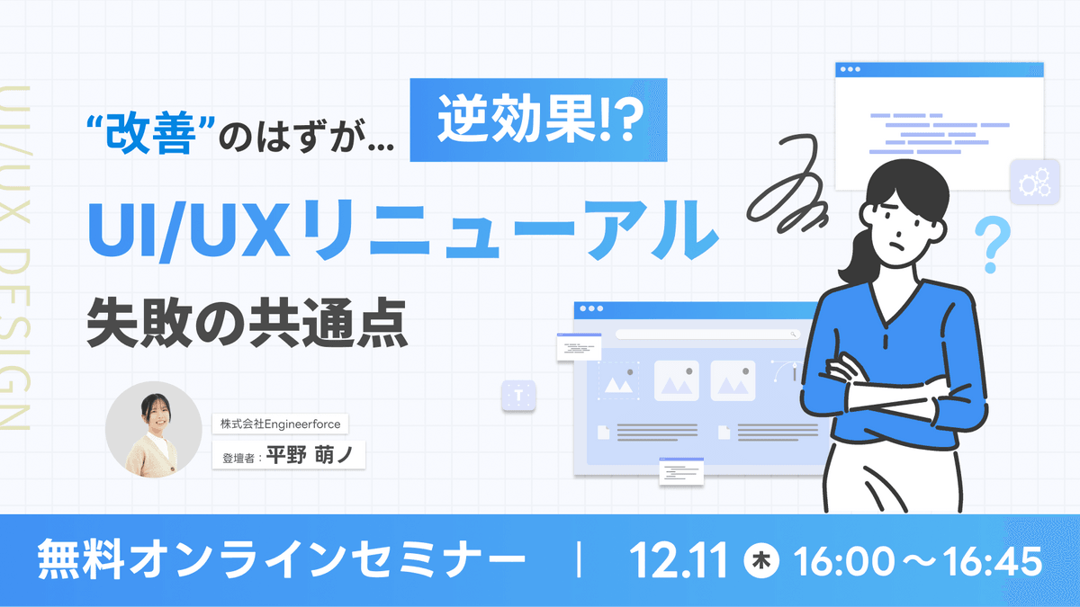 ※ 本セミナーはUI/UX改善を検討している事業者・担当者向けの内容です。デザイナーの方は対象外となりますので、参加はご遠慮ください。