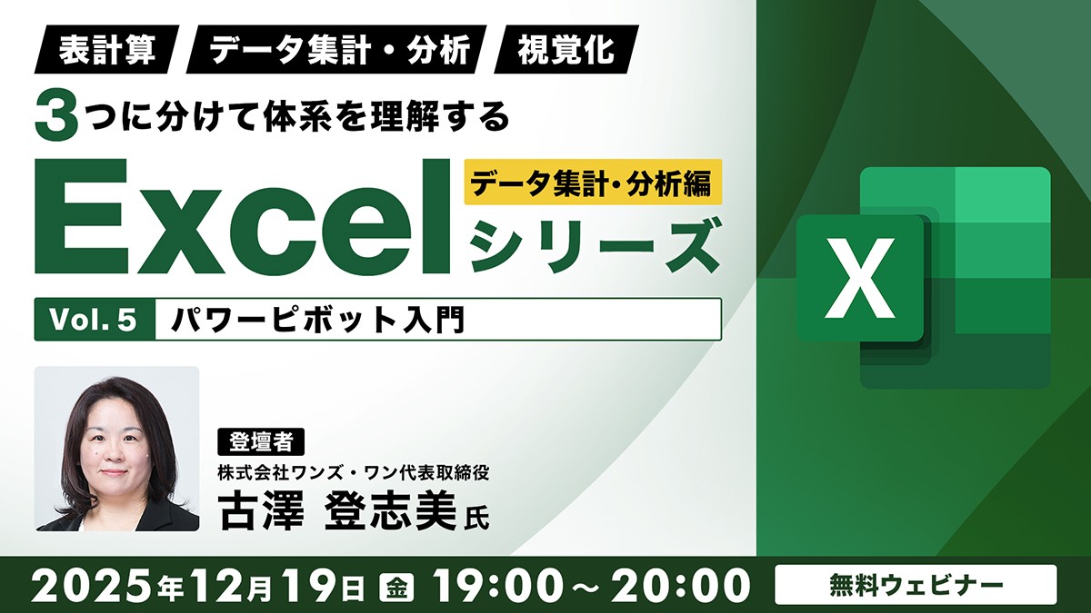 クリーク・アンド・リバー社(C&R社)は、2025年12月19日(金)に、Excelの機能を「表計算ソフト」から「データ集計ツール」として再認識し、より効果的に活用するための知識を身に着けていただける「3つに分けて体系を理解するExcelシリーズ」のデータ集計・分析編 Vol.5を開催します。