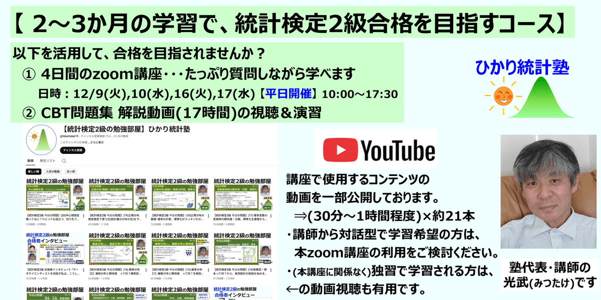 ひかり統計塾では、「統計検定2級 CBT問題集の解説動画」を提供中です。(内容:part.2, part.3の全問題の解説動画)