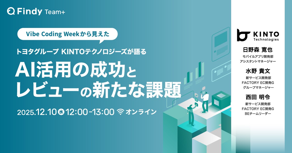 本ウェビナーでは、Vibe Coding Weekを企画・参加したメンバーが登壇し、AI活用の“布教活動”の裏側、Findy Team+による定量データから見えたリアルな成果、そしてAI時代に不可欠となる「レビューの壁」を乗り越えるための具体的な展望を、余すところなくお話しいただきます。ぜひこの機会にご参加ください!