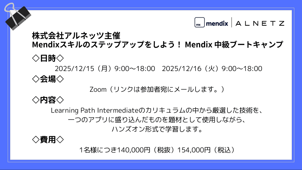 Mendix中級ブートキャンプ申込(決済に関しましては別途メールを送付します。記載の通り有料です。)