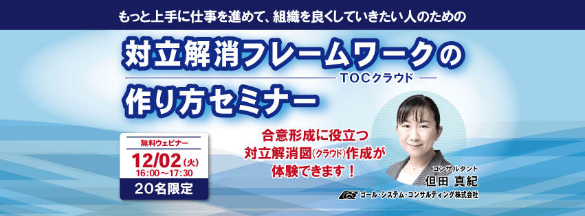 本セミナーではTOC思考プロセスという問題解決手法のなかで使われる、対立解消のフレームワーク「UDEクラウド」の作り方を、体験してもらいながら解説していきます。
