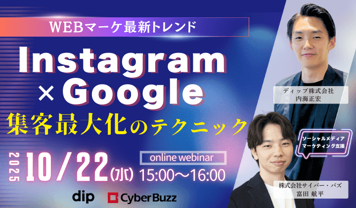 今回はSNSマーケティングのリーディングカンパニー株式会社サイバー・バズ様をお招きし、「Instagram×Google集客最大化のテクニック」をテーマにした特別ウェビナーを開催します!