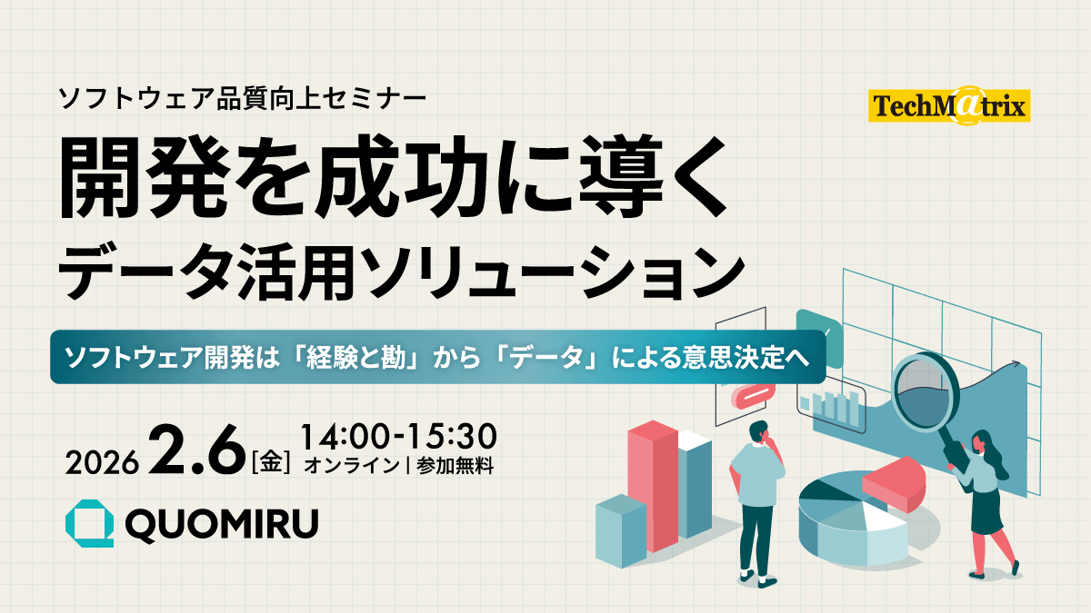 本セミナーでは、ソフトウェア開発におけるデータの可視化と分析の重要性、そしてデータ活用の具体的な例やメリットの解説とともに、開発支援ダッシュボード「Quomiru(クオミル)」を活用したプロジェクトを成功に導くアプローチをご紹介します。