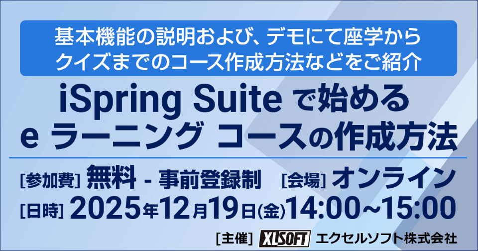 エクセルソフト株式会社 (東京都港区) は、 iSpring Suite で始める e ラーニング コースの作成方法 無料セミナーをオンラインで 2025年 12月 19日 (金) に開催いたします。