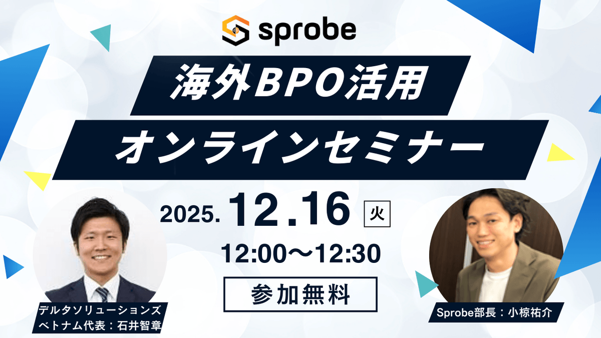 株式会社Sprobeは、2025年12月16日(火)12:00~12:30にオンラインセミナー「人手不足・属人化を解消する海外BPO活用術」を開催いたします。