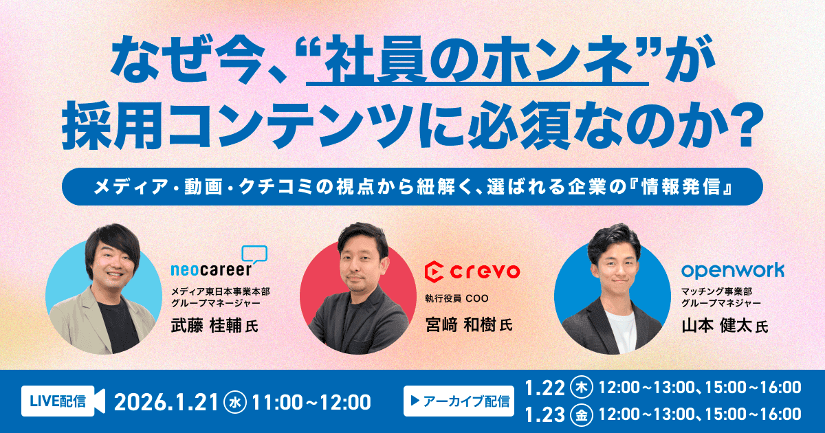 本ウェビナーでは、社員のリアルな声やホンネを採用コンテンツに活かし、応募者の心を動かす方法をわかりやすく紹介します。