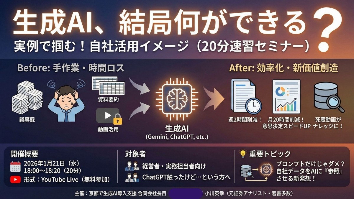 このAI夕活では、議事録作成、資料要約、動画活用という3つの「明日から試せる」実例を、Before/After付きでお見せします。週2時間、月20時間といった具体的な削減効果を知れば、「うちでも使えそう」が見えてくるはず。