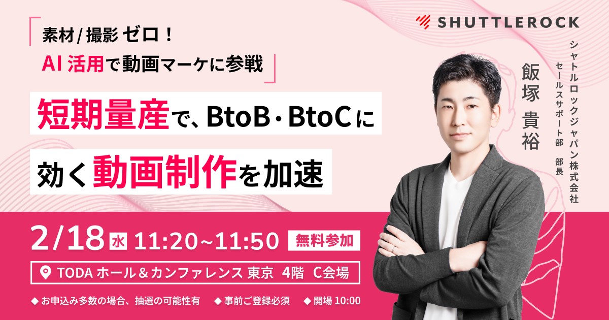 | 11:20 ~ | 短期量産で、 BtoB・BtoCに効く動画制作を加速 ― 素材/撮影ゼロ!AI 活用で動画マーケに参戦 ― シャトルロックジャパン株式会社 |