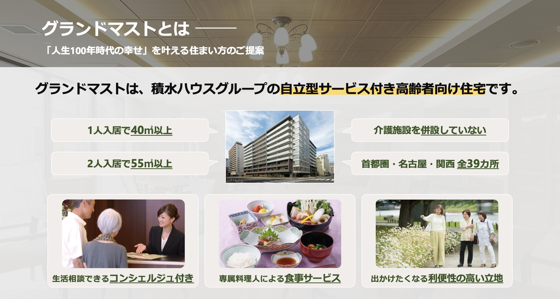 人生100年時代をしあわせにに過ごす。積水ハウスグループのサービス付き高齢者向け住宅「グランドマスト」は、アクティブで誇り高いシニアライフをお手伝いしています。グランドマストが健康長寿の住まいづくりに挑むにあたり、今回は「住まい価値向上」「データ活用」「地域との接続」のためのアイディア・提案を募集します。